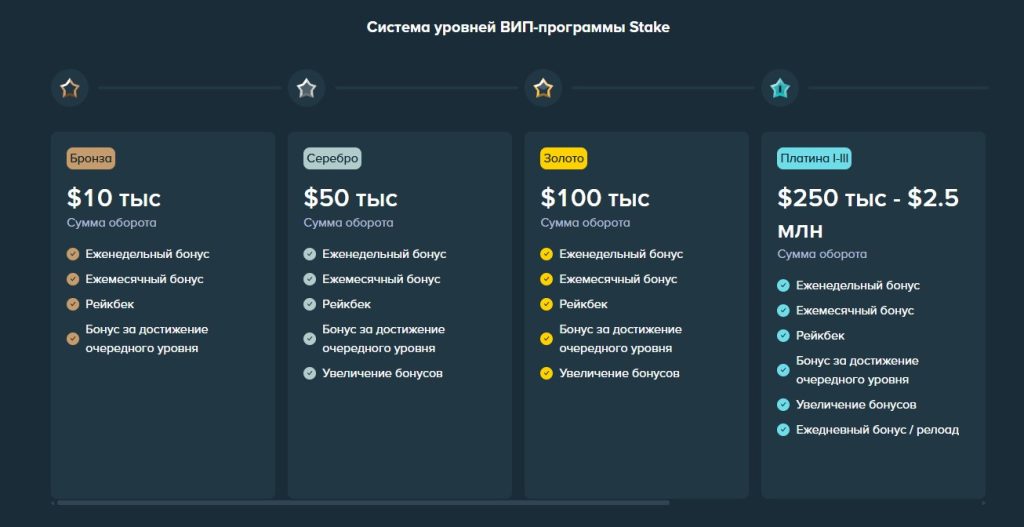 В Stake Casino предусмотрены бонусные предложения как для новых, так и для постоянных игроков: